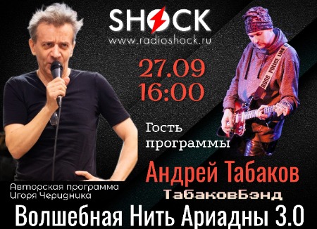В пятницу, 27 сентября, в 16:00 - в прямом эфире Радио ШОК - Игорь Черидник и авторская программа ВОЛШЕБНАЯ НИТЬ АРИАДНЫ. У нас в гостях - Андрей Табаков - ТабаковБэнд. Присоединяйтесь, друзья! Будет интересно!